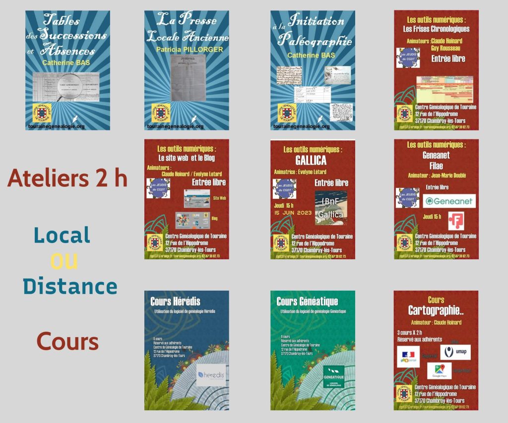 Le Centre Généalogique de Touraine propose des sessions de formations diverses, les Ateliers (2 h) et les cours organisés…